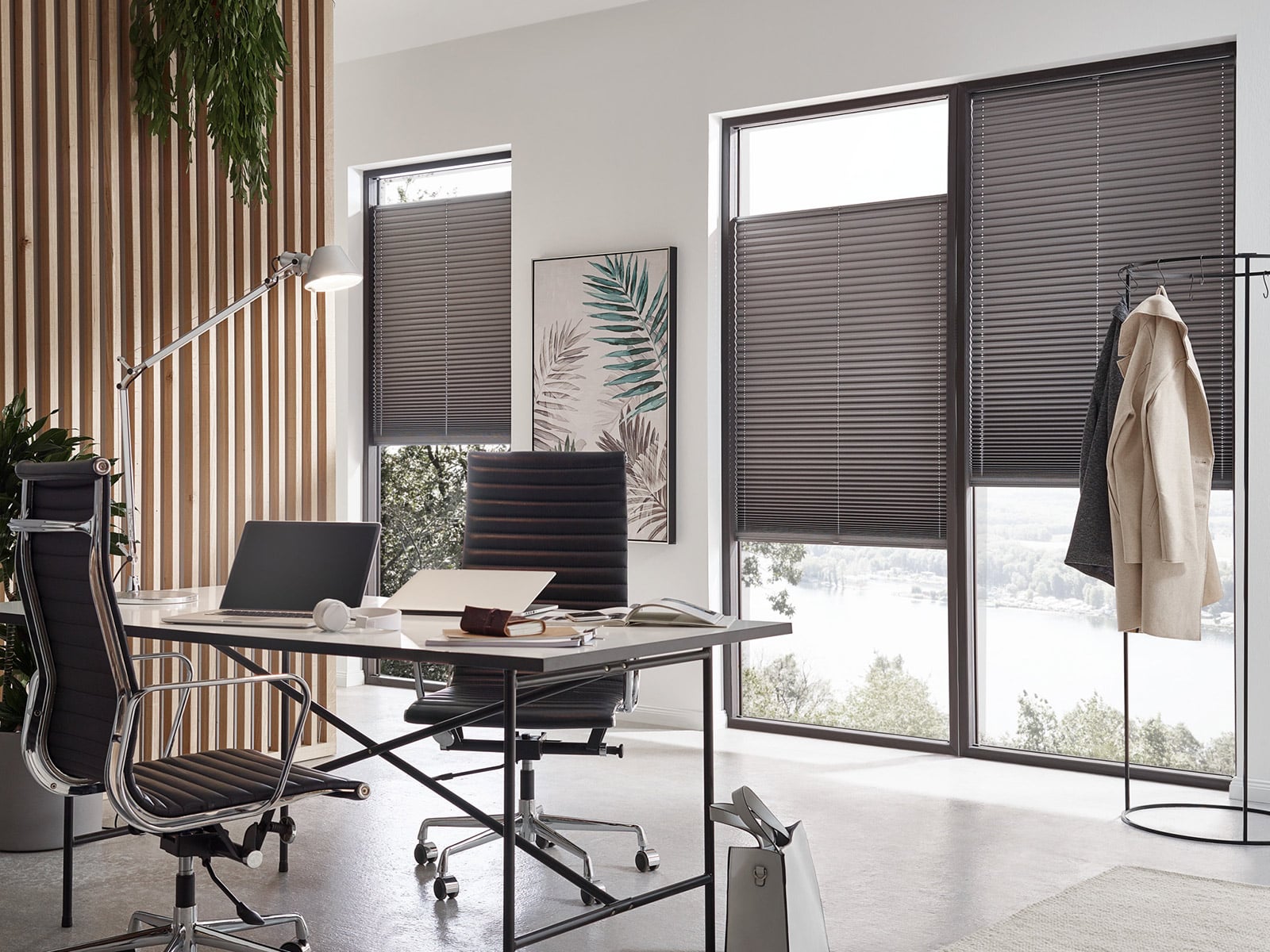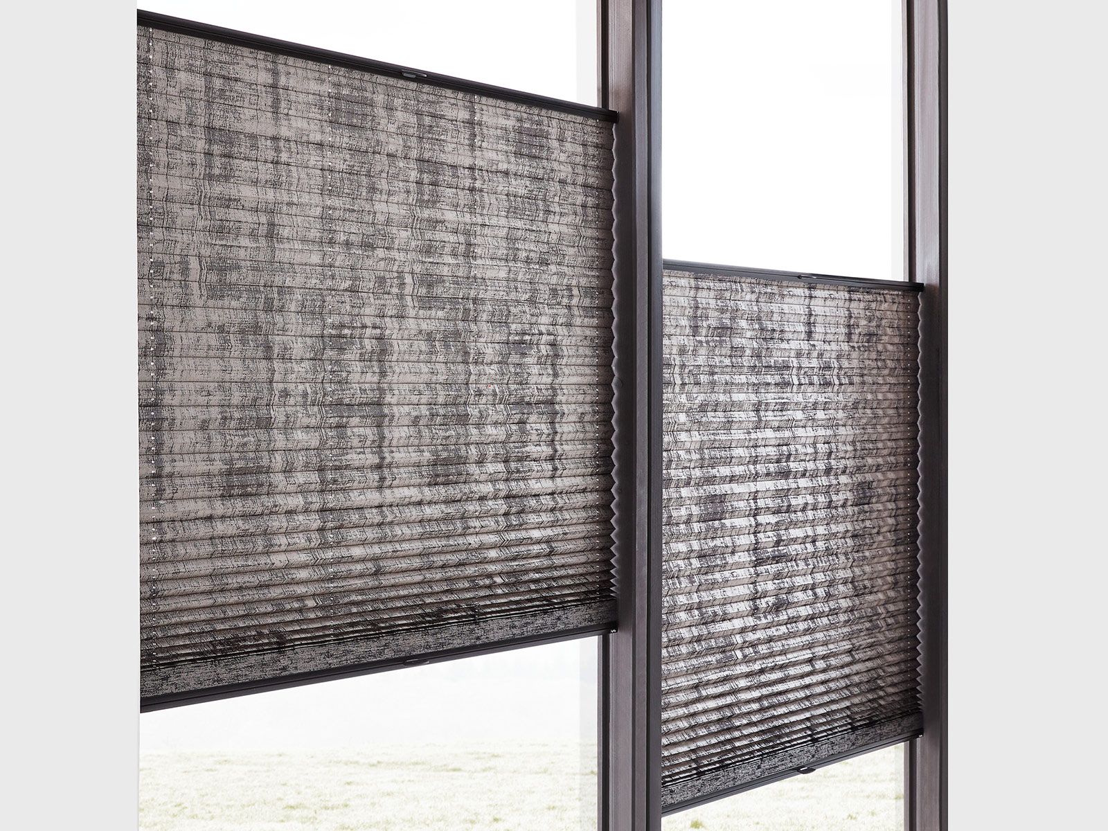 - Stoffvielfalt von transparent bis abdunkelnd: Eine breite Palette an Qualitäten deckt Tageslichtlenkung, Sichtschutz und Verdunkelung ab. Auf Wunsch verbessern Wabenstoffe Akustik und Energiehaushalt im Raum.